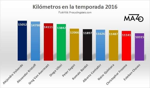 Alejandro Valverde es uno de los corredores que más kilómetros hace al año. Y el que más entre el top ten UCI en 2016. En competición han sido en total 15.052 kilómetros, entre los que se encuentran el Giro, el Tour y la Vuelta completos para completar en total 92 días de competición.