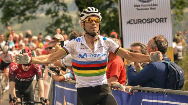 Valverde is back!! El campeón del mundo se ha impuesto en la línea de meta de Saint-Geniez-d’Olt-et-d’Aubrac, en la primera etapa de la Ruta Occitania, la antigua Ruta del Sur, lo que además le sirve para colocarse como líder de la general en la carrera francesa. Qué grande Valverde, y ya van 124 victorias, ahí es nada.