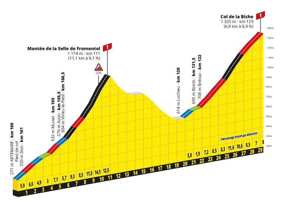 Probablemente el escenario de las batallas en un mundo sin ciclistas como Contador que disfrutaban atacando de lejos. En total 17,4 kilómetros con el 7,1% de pendiente media y rampas máximas del 10%. Un puerto cuya dureza radica en su longitud y en las escasas zonas de descanso, sin olvidar que los ciclistas llegarán al mismo después de dos puertos de primera categoría: El Selle de la Fromentel con 11,1 kilómetros al 8,1 por ciento y La Biche (6,9 kilómetros al 8,9 por ciento)